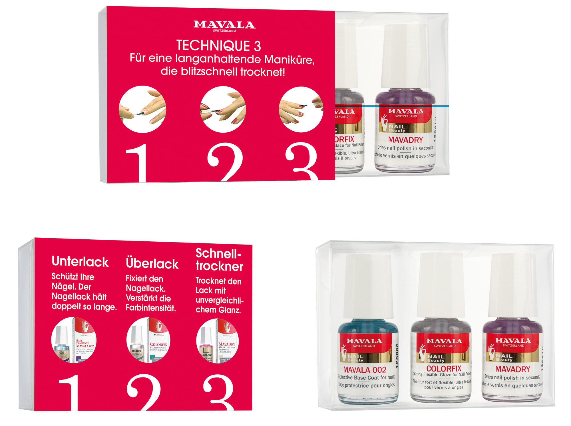 COLORFIX Butyl Acetate, Ethyl Acetate, Isopropyl Alcohol, Nitrocellulose, Phthalic Anhydride/Trimellitic Anhydride/Glycols Copolymer, Acetyl Tributyl Citrate, N-Butyl Alcohol, Acrylates Copolymer, Etocrylene, MEK, Violet 2 (CI 60725). [F907/2] MAVA-DRY Ethyl Acetate, Alcohol Denat., Butyl Acetate, Cellulose Acetate Butyrate, Acrylates Copolymer, Trimethyl Pentanyl Diisobutyrate, Sucrose Benzoate, Tribenzoin, Nitrocellulose, Isopropyl Alcohol, Dimethicone, Violet 2 (CI 60725), Red 17 (CI 26100). [F918/3]